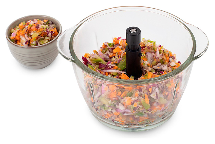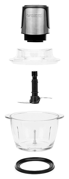 Измельчитель Princess 221051 предназначен для быстрого измельчения овощей, фруктов, льда, сырого и приготовленного мяса без костей и других пищевых продуктов в частных домах и квартирах. Модель оснащена прозрачной крышкой, кнопкой управления и режущим ножом с 2 съемными лезвиями. Ножи выполнены из нержавеющей стали, чаша - из стекла, привод - из металла. Особенности: