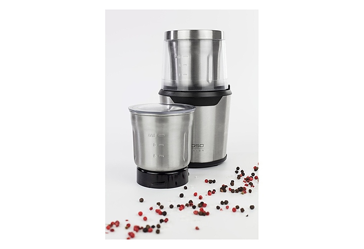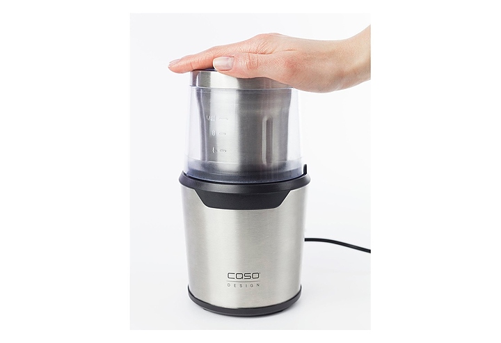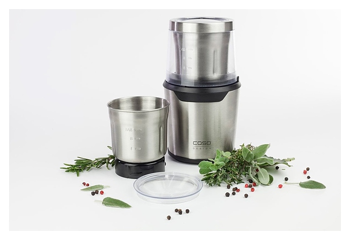 Кофемолка CASO UZ 200 используется в частных домах и квартирах, отелях и офисах для получения молотого кофе из зерен, а также измельчения очищенных орехов, специй и трав. Модель оснащена чашей с 2 лезвиями для измельчения мягких продуктов, чашей с 4 лезвиями для измельчения твердых продуктов и прозрачной крышкой. Корпус, чаши и лезвия выполнены из нержавеющей стали, крышка - из пластика. Особенности: