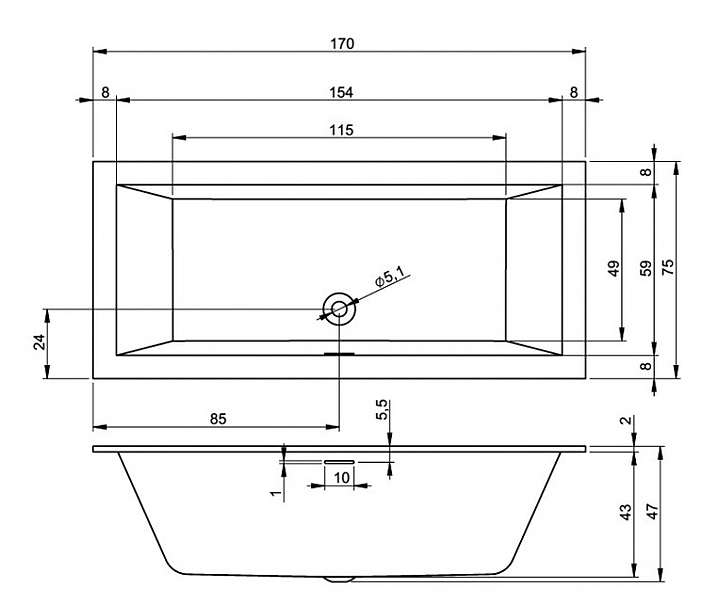 Ванна RIHO RETHING CUBIC FALL 170x75 см (заполнение через перелив), акрил