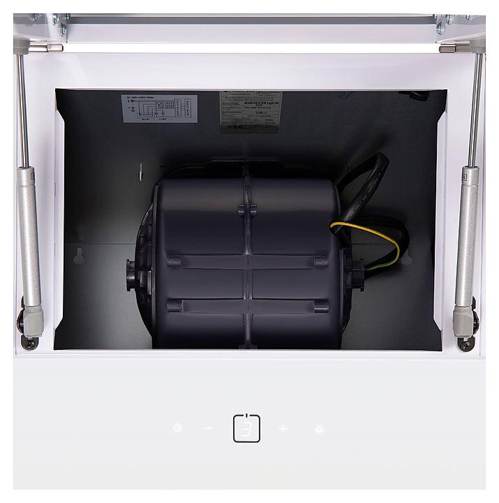 Пристенная кухонная вытяжка Maunfeld Manchester Light 90 предназначена для очистки воздуха от продуктов горения, копоти и запахов в процессе приготовления пищи путем принудительной вентиляции в домашних условиях. Модель оснащена электродвигателем Fime (Италия), состоящей из 3 каскадных пластин наклонной фасадной панелью, 2 круглыми светодиодными светильниками, кнопочной панелью управления с синей подсветкой клавиш и цифровым дисплеем. Корпус выполнен из высококачественной стали с термостойким покрытием белого цвета, пластины фасада – из прочного белого закаленного стекла с глянцевой поверхностью, фильтр – из алюминия. В комплект поставки входят набор монтажных креплений, гофра, адаптер на 120 мм, антивозвратный клапан и инструкция по эксплуатации. Особенности:
