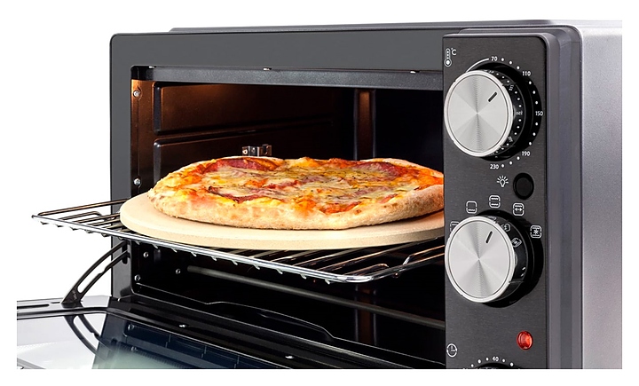 Мини-печь CASO TO 26 Classic предназначена для приготовления и разогрева различных блюд, выпечки кондитерских и хлебобулочных изделий на предприятиях общественного питания и торговли, а также в домашних условиях. Модель оснащена 4 нагревательными элементами, откидной дверцей с горизонтальной рукояткой и обзорным окном, механической панелью управления с 3 круглыми поворотными переключателями. Корпус с черным покрытием и рукоятка серебристого цвета выполнены из стали, нагревательные элементы – из высококачественной нержавеющей стали, внутренняя облицовка камеры с антипригарным покрытием, остекление фронта черного цвета. В комплект поставки входят решетка для гриля, противень, камень для выпечки пиццы и поддон для рошек из нержавеющей стали. Особенности: