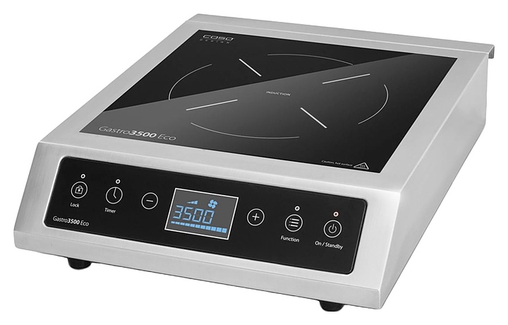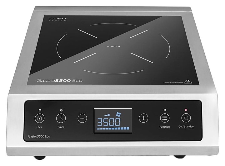 Настольная индукционная плита CASO Gastro 3500 Eco предназначена для приготовления и быстрого разогрева блюд в отелях, офисах и домашних условиях. Модель оснащена сенсорной панелью управления и дисплеем с индикацией синего цвета. Корпус выполнен из нержавеющей стали, рабочая поверхность – из стеклокерамики черного цвета. Особенности: