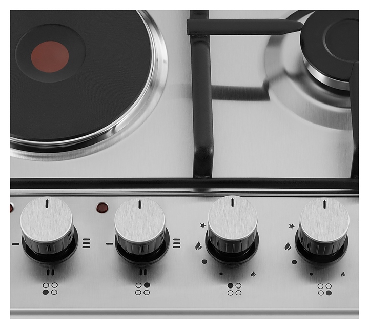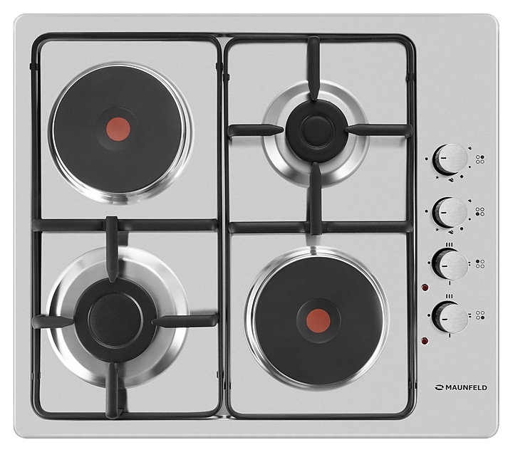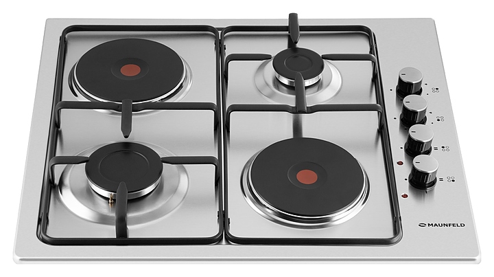 Комбинированная варочная панель Maunfeld EEHS.64.5ES/KG предназначена для приготовления большого ассортимента блюд на предприятих общественного питания и в домашних условиях. Модель оснащена 4 высококачественными конфорками различной мощности: 2 газовыми Sabaf (Италия) и 2 электрическими, 2 фирменными решетками Zeniya (Турция), 4 поворотными переключателями и кабелем питания с вилкой. Корпус и рабочая поверхность выполнены из нержавеющей стали, решетки – из стали с термостойким напылением темной матовой эмалью, переключатели – из прочного термостойкого пластика черного цвета со стальными наконечниками, электрическая конфорка состоит из чугунного диска на стальной опоре, нагревательной спирали, термостата и клеммной колодки. В комплект поставки входят набор монтажных креплений и сменные жиклеры Sourdillon (Франция) для балонного газа. Особенности:
