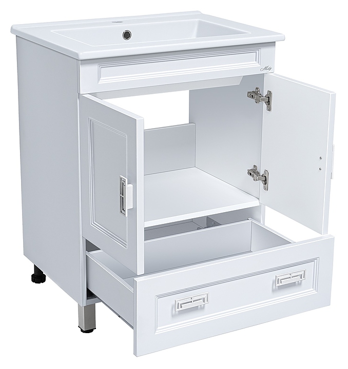 Тумба под раковину Misty Дива-85 выполнена в современном классическом стиле и идеально впишется в интерьер любой ванной комнаты. Напольная конструкция обеспечивает легкий монтаж и не требует специального ремонта в помещении. Модель оснащена закрытым отделением с 2 распашными дверцами и 1 выдвижным ящиком с направляющими с доводчиком скрытого монтажа. Корпус изделия выполен из ЛДСП с покрытием эмалью, фасад - из МДФ с покрытием эмалью. Тумба может использоваться с раковиной Kirovit Оскар-85. Комплектация: