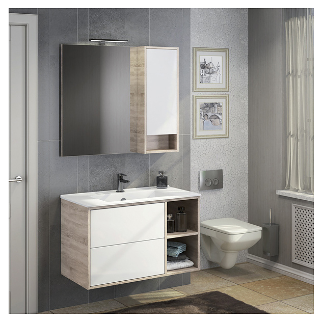 Правосторонне зеркало Comforty Гамбург-90 дополнит интерьер любой ванной комнаты. Благодаря подвесной конструкции модель не занимает много места, что позволяет экономить пространство в ванной комнате, а также облегчает уборку. Модель оснащена открытой полкой в нижней части, шкафчиком с распашной дверцей, петлями с функцией плавного закрывания и 2 полками внутри. Корпус выполнен из влагостойкой ЛДСП, фасад - из МДФ, зеркальное полотно - амальгамой на основе серебра. Дополнительные характеристики: