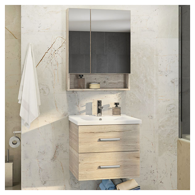Зеркальный шкаф Comforty Парма-60 дополнит интерьер ванной комнаты. За счет подвесной конструкции изделие не занимает много места, что позволяет экономить пространство, а также облегчает уборку. Модель оснащена открытой полкой в нижней части, 2 распашными дверцами плавного закрывания, 2 полками за широкой и 1 полкой за узкой дверцами. Корпус выполнен из влагостойкой ЛДСП, зеркальное полотно - с амальгамой на основе серебра. Дополнительные характеристики: