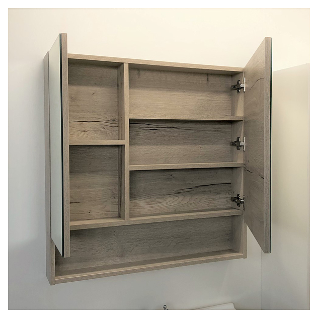Зеркальный шкаф Comforty Парма-80 дополнит интерьер ванной комнаты. За счет подвесной конструкции изделие не занимает много места, что позволяет экономить пространство, а также облегчает уборку. Модель оснащена открытой полкой в нижней части, 2 распашными дверцами плавного закрывания, 2 полками за широкой и 1 полкой за узкой дверцами. Корпус выполнен из влагостойкой ЛДСП, зеркальное полотно - с амальгамой на основе серебра. Дополнительные характеристики: