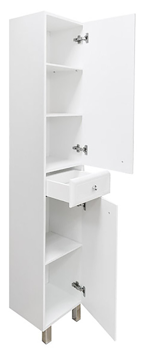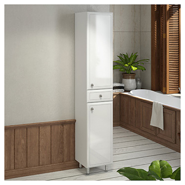 Шкаф-пенал Comforty Сочи-35 дополнит интерьер ванной комнаты. Модель оснащена 2 дверцами плавного закрывания, выдвижным ящиком в средней части, 2 полками за верхней дверью, полкой за нижней дверью и ножками, защищающими конструкцию в случае намокания пола. Корпус выполнен из влагостойкой ЛДСП, фасад - из МДФ с белой глянцевой эмалью. Дополнительные характеристики: