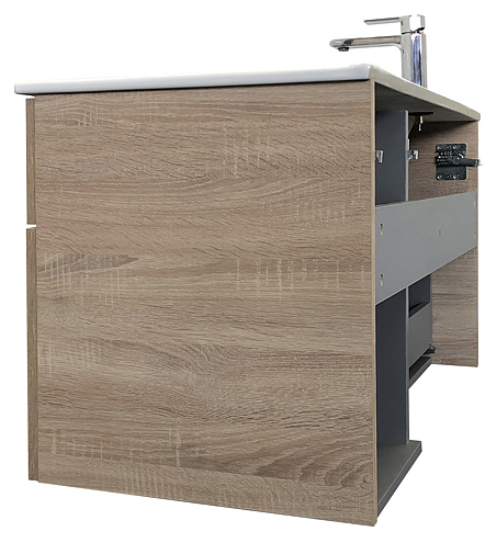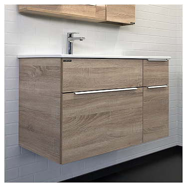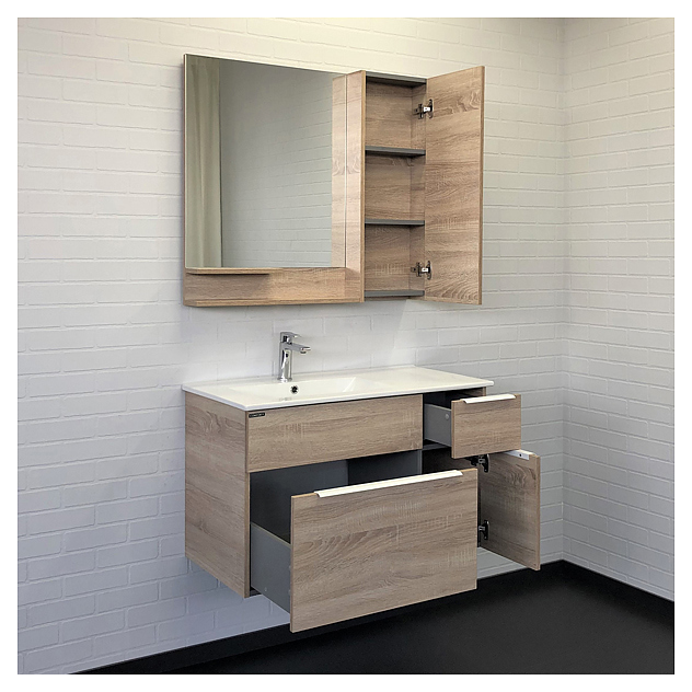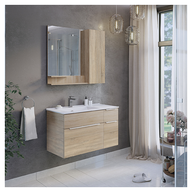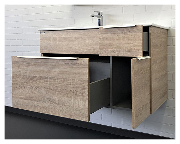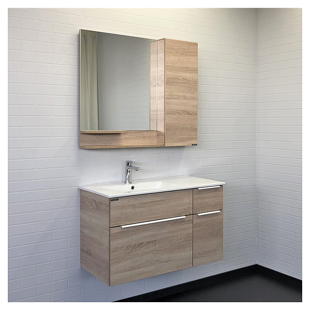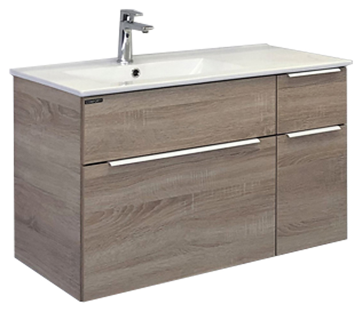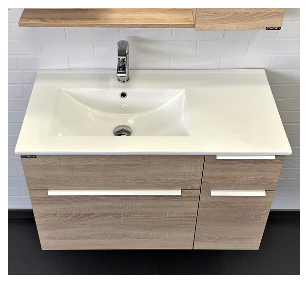 Тумба с раковиной Comforty Варна-90 дополнит интерьер ванной комнаты. Благодаря подвесной конструкции модель не занимает много места, что экономит пространство и облегчает уборку. Тумба оснащена 2 выдвижными ящиками и распашной дверцей. Раковина имеет широкую боковую поверхность, слив-перелив и одно отверстие для смесителя, расположенное сбоку. Изделие выполнено из влагостойкой ЛДСП, раковина - из санфарфора, который обладает повышенной прочностью и устойчивостью к негативным внешним факторам, а также долгое время сохраняет идеальную белизну и не впитывает запахи и грязь. В комплект входит белая раковина Comforty 9090EL. Дополнительные характеристики: