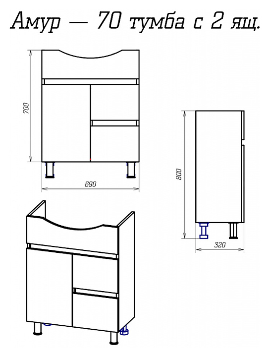 Тумба под раковину Misty Амур-70 выполнена в современном стиле и идеально впишется в интерьер любой ванной комнаты. Напольная конструкция обеспечивает легкий монтаж и не требует специального ремонта в помещении. Модель оснащена закрытым отделением с распашной дверцей и 2 выдвижными ящиками. Корпус изделия выполнен из ЛДСП с покрытием пленкой, фасад - из МДФ, полки - из ЛДСП. Тумба может использоваться вместе с раковиной Универсал Амур-70 см. Комплектация:
