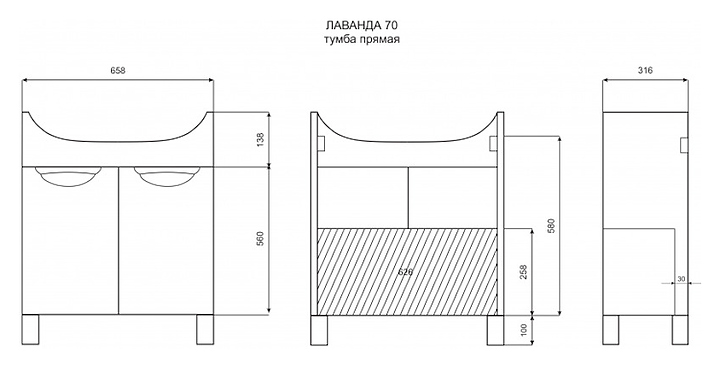 Тумба под раковину Misty Лаванда-70 выполнена в современном стиле и идеально впишется в интерьер любой ванной комнаты. Напольная конструкция обеспечивает легкий монтаж и не требует специального ремонта в помещении. Модель оснащена закрытым отделением с 2 распашными дверцами и полкой внутри. Корпус изделия выполнен из ЛДСП, фасад - из МДФ с покрытием эмалью. Тумба может использоваться вместе с раковиной Santek Балтика 70. Комплектация:
