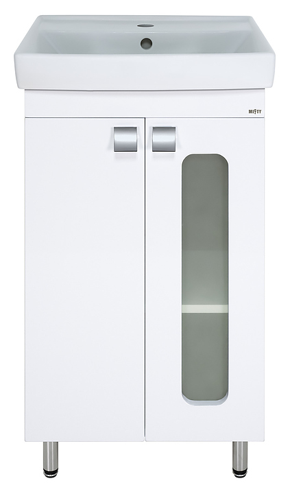 Тумба под раковину Misty Урал-50 выполнена в современном стиле и идеально впишется в интерьер любой ванной комнаты. Напольная конструкция обеспечивает легкий монтаж и не требует специального ремонта в помещении. Модель оснащена закрытым отделением с 2 распашными дверцами и полкой внутри. Корпус изделия выполнен из ЛДСП, фасад - из МДФ с покрытием пленкой и стекла. Тумба может использоваться с раковиной Универсал Енисей-50 см. Комплектация: