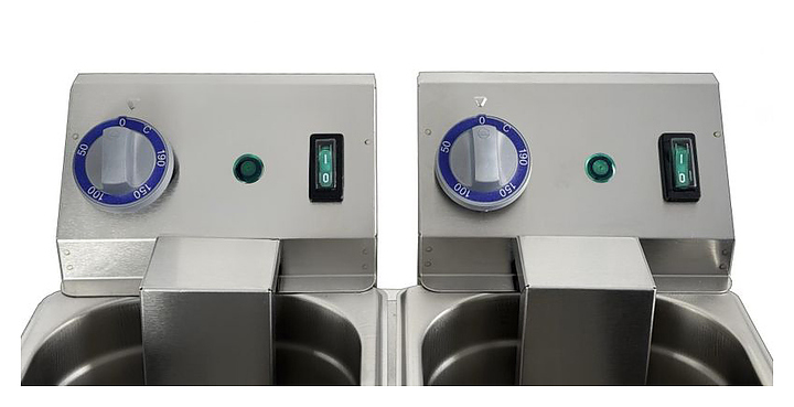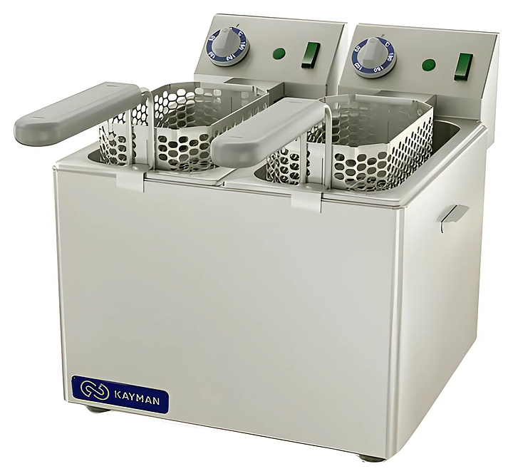 Фритюрница KAYMAN ФЭ-2-1/3x200 А используется на предприятиях общественного питания и торговли для приготовления мяса, рыбы, овощей, мучных изделий и других продуктов в разогретом масле (фритюре). Модель состоит из 2-х фритюрных ванн и 2 блоков управления ТЭНами с терморегуляторами. Корпус, ванна и ТЭН выполнены из нержавеющей стали. В комплект поставки входят 2 корзины с крышками. Особенности: