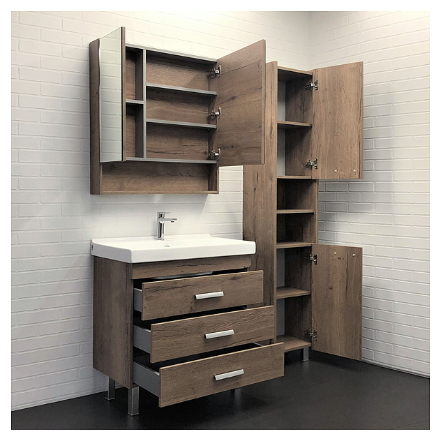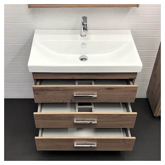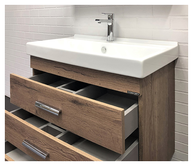 Тумба с раковиной Comforty Никосия-80Н дополнит интерьер ванной комнаты. Модель оснащена 3 выдвижными ящиками плавного закрывания и ножками, защищающими конструкцию в случае намокания пола. Раковина имеет широкую заднюю поверхность для размещения аксессуаров, слив-перелив и отверстие для смесителя, расположенное по центру. Изделие выполнено из влагостойкой ЛДСП, раковина - из санфарфора, который обладает повышенной прочностью и устойчивостью к негативным внешним факторам, а также долгое время сохраняет идеальную белизну и не впитывает запахи и грязь. В комплект входит раковина Fest 80. Дополнительные характеристики: