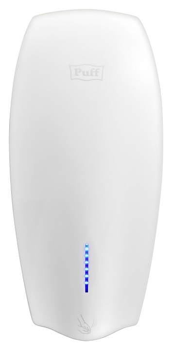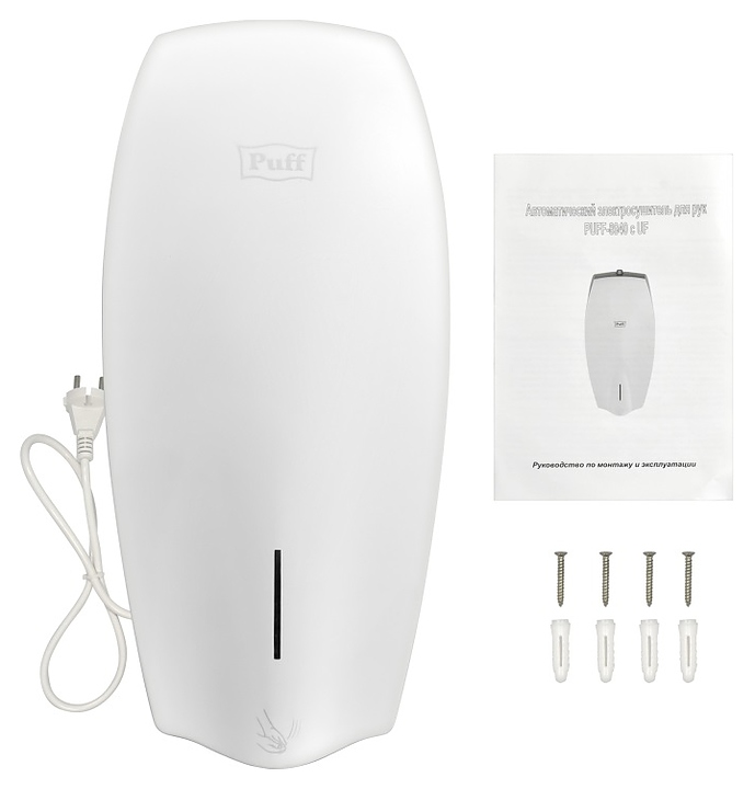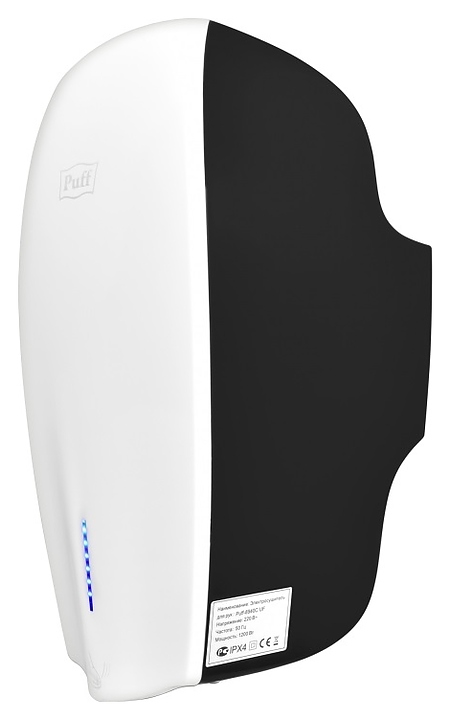 Сушилка для рук Puff 8940 используется в туалетных комнатах торговых центров, гостиниц, аэропортов, предприятий общеcтвенного питания и других местах массового пребывания для бесконтактной гигиеничной сушки. Модель оснащена нагревательным элементом, электродвигателем с вентилятором, , ультрафиолетовой лампой и кабелем питания с вилкой. Обтекаемый корпус выполнен из ударопрочного АБС-пластика: белая лицевая панель и черная задняя. В комплект поставки входят монтажная планка, набор креплений и инструкция по эксплуатации. Особенности: