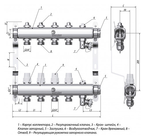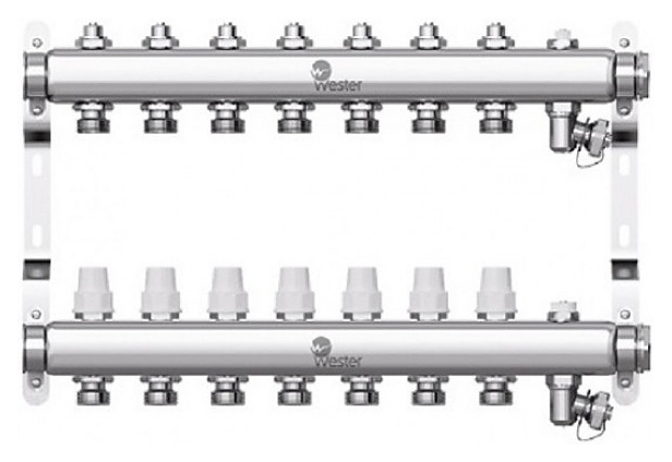 Группа коллекторная Wester W903 0-32-1890 предназначена для оптимизации и контроля распределения теплоносителя в системах радиаторного отопления и подогрева пола. Модель оснащена подающим коллектором с с ручными балансировочными клапанами и обратным коллектором с запорными клапанами. Комплект выполнен из нержавеющей стали AISI 304. Комплект: