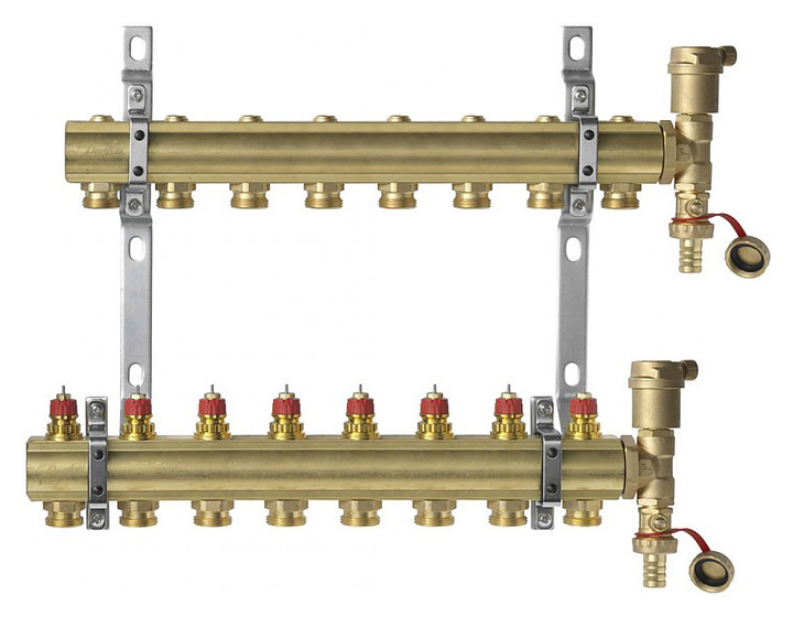 Группа коллекторная DANFOSS FHF-set 088U0708 предназначена для контроля и распределения теплоносителя в системе водяного отопления и теплого водяного пола. Модель оснащена подающим коллектором с запорными клапанами и обратным коллектором со встроенными термостатическими клапанами. Комплект выполнен из латуни. Комплект:
