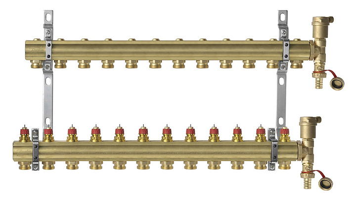 Группа коллекторная DANFOSS FHF-set 088U0712 предназначена для контроля и распределения теплоносителя в системе водяного отопления и теплого водяного пола. Модель оснащена подающим коллектором с запорными клапанами и обратным коллектором со встроенными термостатическими клапанами. Комплект выполнен из латуни. Комплект: