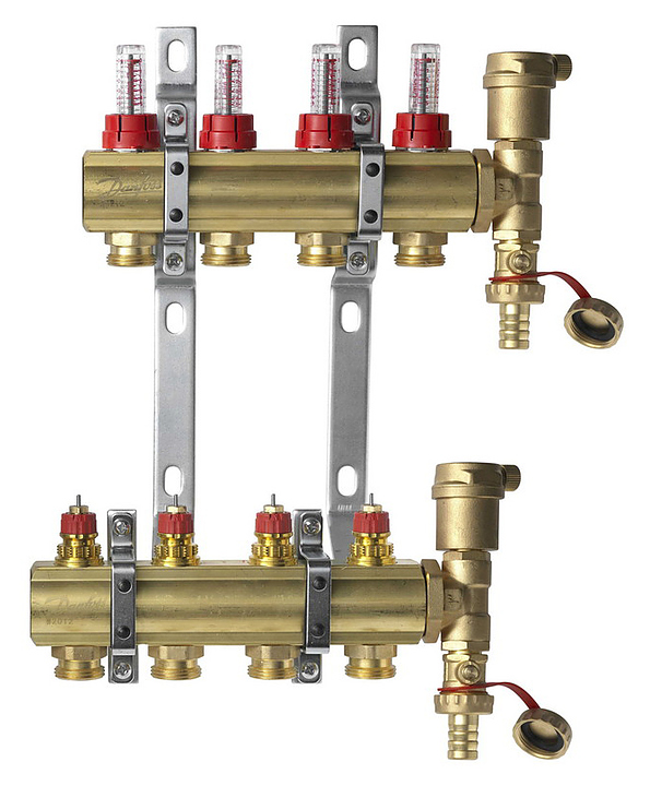 Группа коллекторная DANFOSS FHF-F set 088U0724 предназначена для контроля и распределения теплоносителя в системе водяного отопления и теплого водяного пола. Модель оснащена подающим коллектором с расходомерами и обратным коллектором со встроенными термостатическими клапанами. Комплект выполнен из латуни. Комплект: