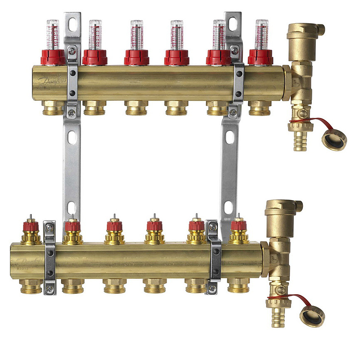 Группа коллекторная DANFOSS FHF-F set 088U0726 предназначена для контроля и распределения теплоносителя в системе водяного отопления и теплого водяного пола. Модель оснащена подающим коллектором с расходомерами и обратным коллектором со встроенными термостатическими клапанами. Комплект выполнен из латуни. Комплект: