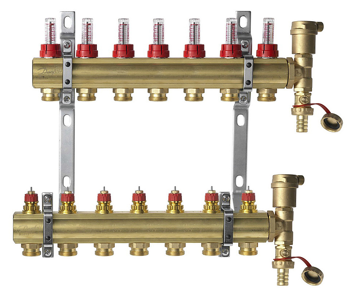 Группа коллекторная DANFOSS FHF-F set 088U0727 предназначена для контроля и распределения теплоносителя в системе водяного отопления и теплого водяного пола. Модель оснащена подающим коллектором с расходомерами и обратным коллектором со встроенными термостатическими клапанами. Комплект выполнен из латуни. Комплект: