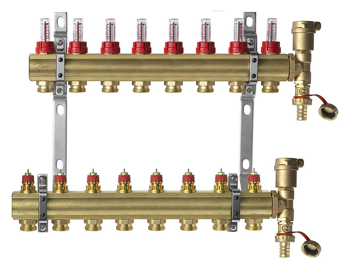 Группа коллекторная DANFOSS FHF-F set 088U0728 предназначена для контроля и распределения теплоносителя в системе водяного отопления и теплого водяного пола. Модель оснащена подающим коллектором с расходомерами и обратным коллектором со встроенными термостатическими клапанами. Комплект выполнен из латуни. Комплект:
