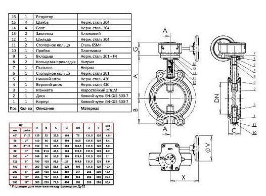 Затвор дисковый поворотный Tecofi VPI4448-08EP Ду 200 Ру16 межфл с редуктором диск чугун манжета EPDM VPI4448-08EP0200