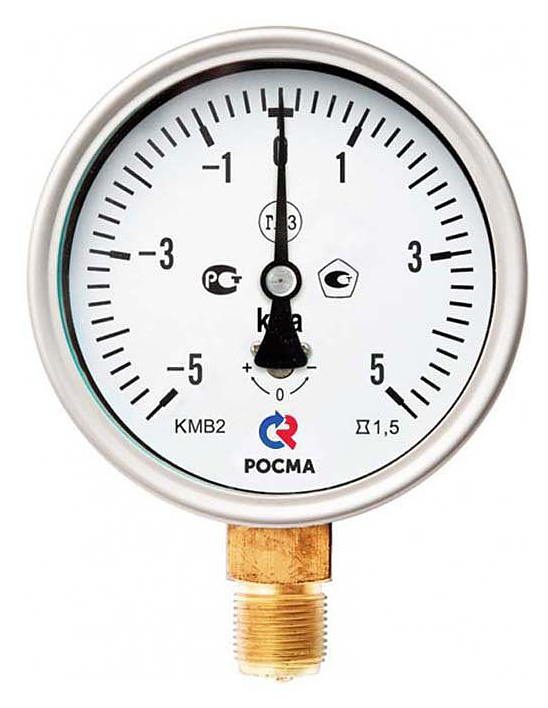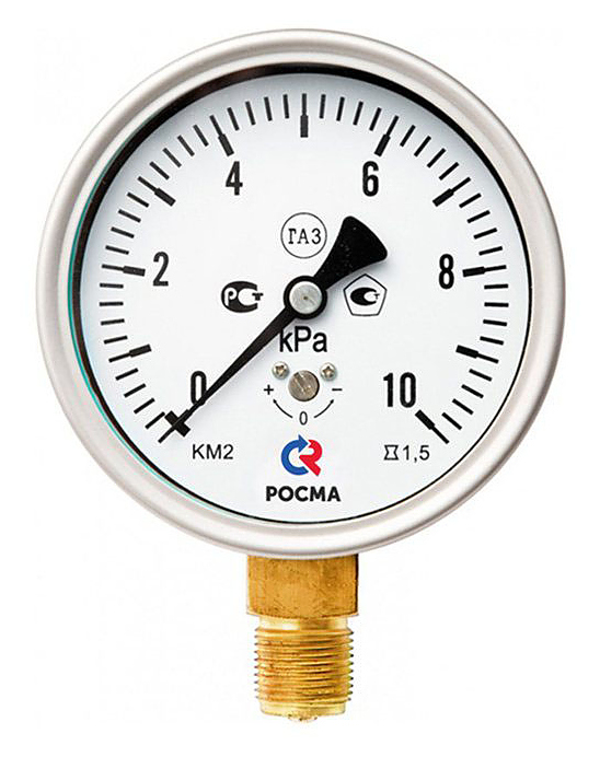 Манометр радиальный Росма КМ-22Р 00000002253 предназначен для измерения давления сухих, газообразных сред, неагрессивных к медным сплавам. Наромеры применяются в системах газораспределения, котельном, медицинском и лабораторном оборудовании. Корпус прибора выполнен из нержавеющей стали, механизм и чувствитенльный элемент - из медного сплава, циферблат - алюминиевый, стекло-минеральное. Особенности: