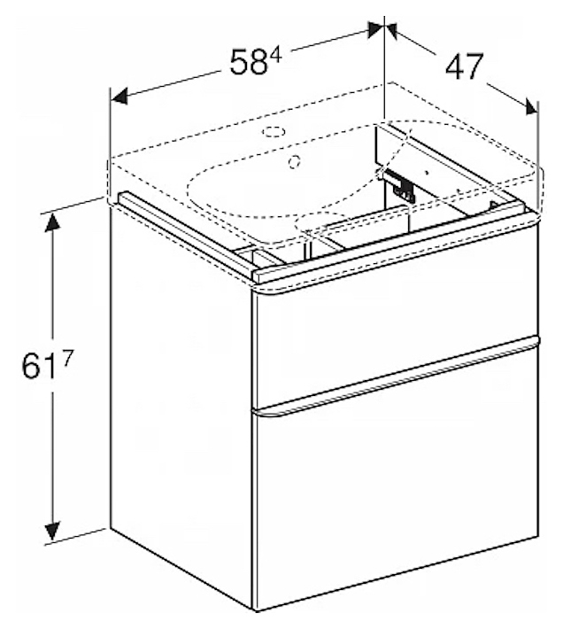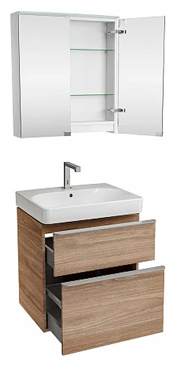 Гарнитур Geberit Smyle Square 60 выполнен в современном стиле и легко впишется в интерьер любой ванной комнаты. В комплект входит тумба под раковину Smyle Square 500.352.JR.1, раковина Smyle Square 500.229.01.1 и зеркальный шкаф Option Basic 500.273.00.1. Тумба оснащена 2 выдвижными ящиками, зеркальный шкаф - 2 стеклянными полками и подсветкой. Раковина имеет одно отверстие для смесителя, расположенное по центру и встроенный слив-перелив. Корпус мебели выполнен из влагостойкой ЛДСП. Смеситель в комплект поставки не входит и приобретается отдельно. Особенности: