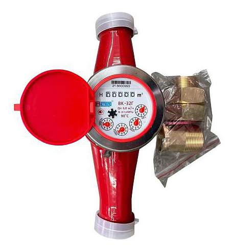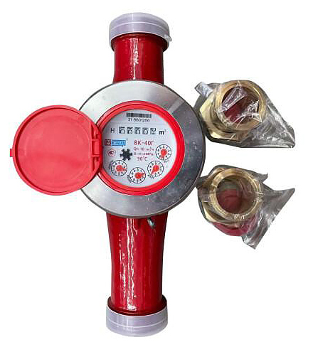 Счётчик горячей воды Метер ВК-Г Ду 40 используется для измерения и учёта объёма питьевой воды и сетевой воды, протекающей по трубопроводу в водопроводной сети на промышленных предприятиях и в жилищно-коммунальном хозяйстве. Прибор оснащен измерительной камерой, крыльчаткой, магнитной муфтой и счетным механизмом. Корпус прибора выполнен из латуни и окрашен в красный цвет. В комплект поставки входит набор монтажных частей и прокладок. Особенности: