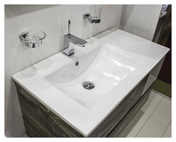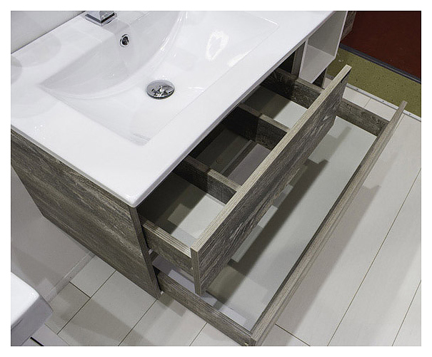 Тумба с раковиной Comforty Турин-90L дополнит интерьер ванной комнаты. Благодаря подвесной конструкции модель не занимает много места, что экономит пространство и облегчает уборку. Тумба оснащена 2 выдвижными ящиками плавного закрывания и открытой полкой в боковой части. Левосторонняя раковина имеет широкую боковую поверхность для размещения аксессуаров, слив-перелив и отверстие для смесителя. Изделие выполнено из влагостойкой ЛДСП, раковина - из санфарфора, который обладает повышенной прочностью и устойчивостью к негативным внешним факторам, не впитывает запахи и грязь. В комплект входит раковина Comforty 9090EL. Дополнительные характеристики:
