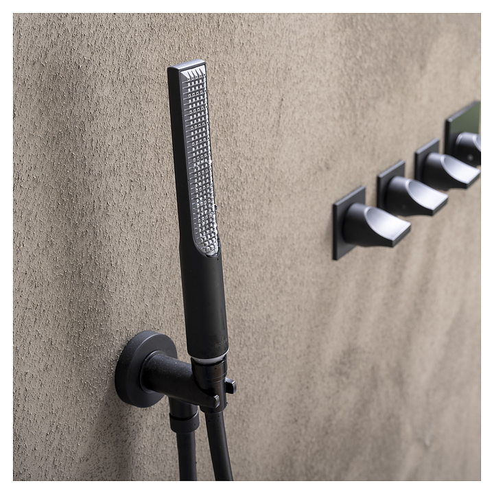 Душевой гарнитур Bossini Apice CE3004C.073 выполнен в современном стиле и предназначен для использования в ванных комнатах для личной гигиены и в бытовом плане, для удобного наполнения и ополаскивания различных ёмкостей водой. Модель оснащена системой Easy-Clean для легкой очистки от известковых отложений. Изделие выполнено из экологических материалов, хромированного ABS-пластика и покрытий, которые легки в очистке и не вызывают аллергических реакций, держатель - из латуни, которая отличается прочностью, долговечностью и устойчивостью к перепадам температур, шланг - из ПВХ. В комплект поставки входят ручной душ с водорозеткой скрытого монтажа, держатель и душевой шланг. Особенности: