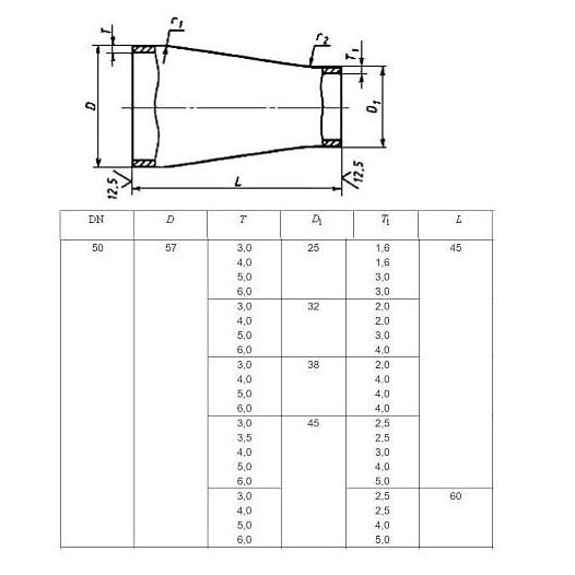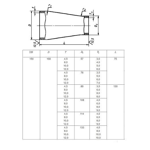 Переход Россия Дн 273х7-133х4 используется для герметичного соединения труб различного диаметра без изменения направления. Особенности:
