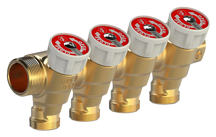 Коллектор Giacomini R585C R585CY064 3/4" ВР/НР на 4 вых 1/2" НР м/о 35мм под евроконус с запорными клапанами