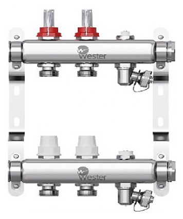Группа коллекторная Wester W902 0-32-1810 предназначена для оптимизации и контроля распределения теплоносителя в системах радиаторного отопления и подогрева пола. Модель оснащена подающим коллектором с расходомерами и обратным коллектором с запорными клапанами. Комплект выполнен из нержавеющей стали AISI 304. Комплект: