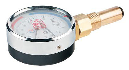 Термоманометр радиальный Росма ТМТБ-41Р.2 00000002365 предназначен для измерения давления и температуры в системах отопления, водоснабжения, бойлерах и паровых котлах. Модель оснащена чувствительным элементом, манометрической и термометрической частью, трибкосекторным механизмом, клапаном и биметаллической спиралью. Корпус прибора выполнен из стали, штуцер манометра - из медного сплава, патрубок - из латуни, циферблат - алюминиевый, стекло-минеральное, кольцо - из хромированной стали. В комплект поставки входит прибор, автоматический запорный клапан, паспорт прибора. Особенности:
