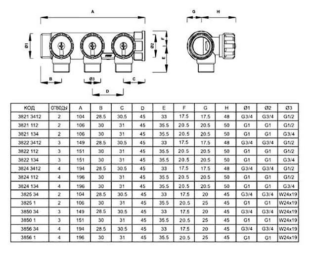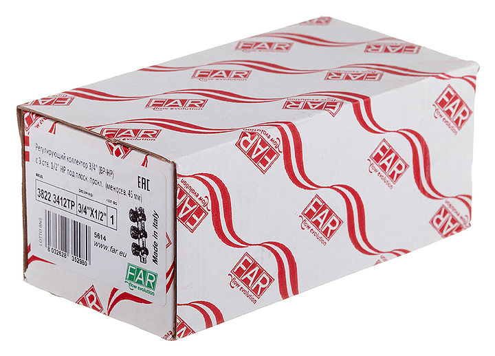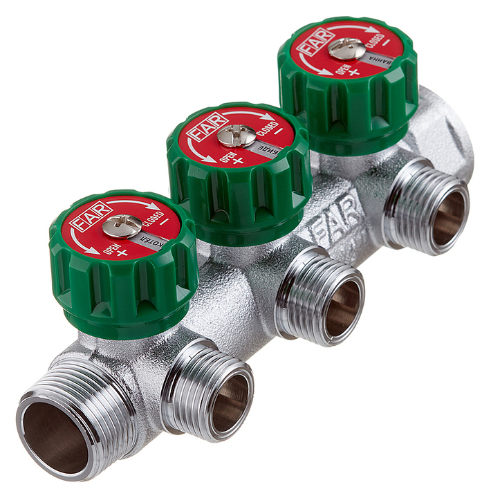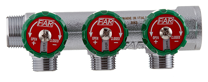 Коллектор FAR MULTIFAR FK 3822 3412TP 3/4" ВР/НР на 3 вых 1/2" НР м/о 45мм под плоское уплотнение с регулирующими клапанами