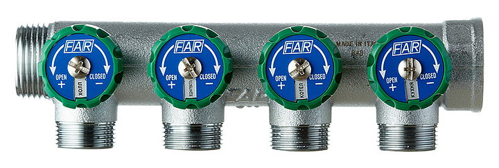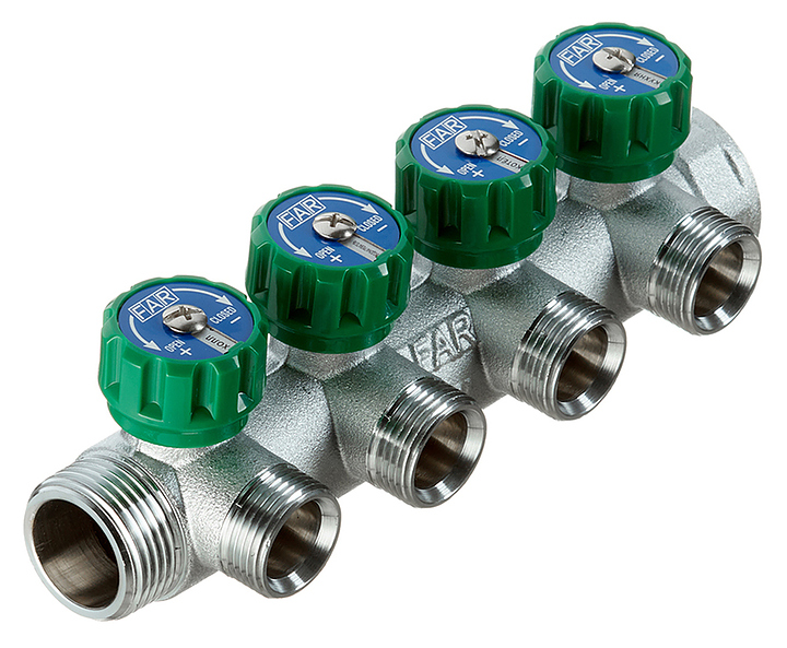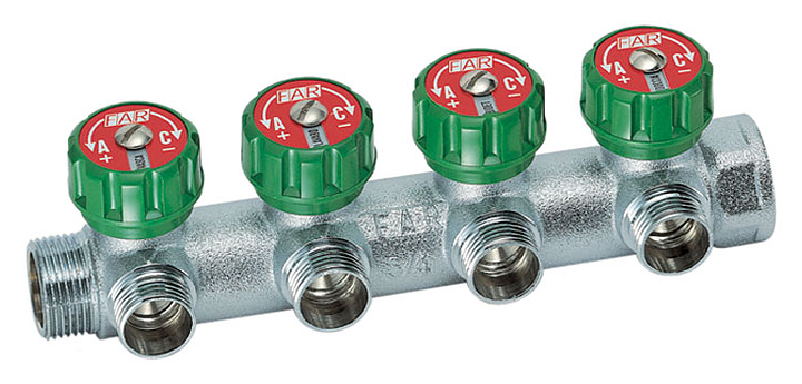 Коллектор FAR MULTIFAR FK 3824 134 1" ВР/НР на 4 вых 3/4" НР м/о 45мм под евроконус с регулирующими клапанами