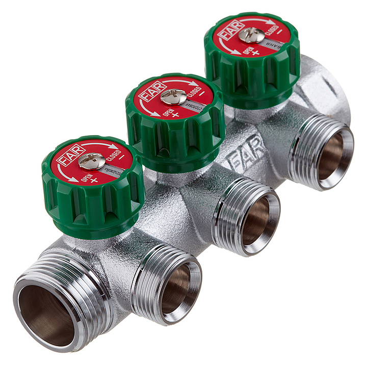 Коллектор FAR MULTIFAR FK 3822 134 1" ВР/НР на 3 вых 3/4" НР м/о 45мм под евроконус с регулирующими клапанами