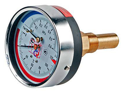 Термоманометр осевой Росма ТМТБ-31Т.2 00000002302 предназначен для измерения давления и температуры в системах отопления, водоснабжения, бойлерах и паровых котлах. Модель оснащена чувствительным элементом, манометрической и термометрической частью, трибкосекторным механизмом, клапаном и биметаллической спиралью. Корпус прибора выполнен из стали, штуцер манометра - из медного сплава, патрубок - из латуни, циферблат - алюминиевый, стекло-минеральное, кольцо - из хромированной стали. В комплект поставки входит прибор, автоматический запорный клапан, паспорт прибора. Особенности: