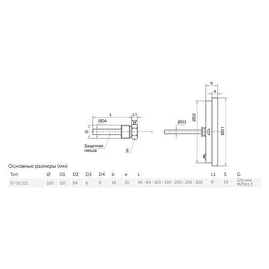 Термометр биметаллический осевой Росма Дк100 L=64мм G1/2" 100С БТ-51.211