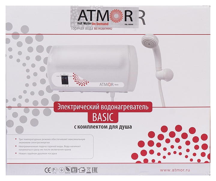 Электрический проточный водонагреватель Atmor BASIC 3,5 KW SHOWER используется в местных системах водоснабжения для постоянного автономного обеспечения горячей водой одной или нескольких точек водоразбора таких как санитарные узлы, кухни в жилых и загородных частных домах, а также других бытовых и хозяйственных объектах. Модель оснащена нагревательной емкостью, погружным трубчатым электронагревателем (ТЭНом), термостатом, резьбовыми штуцерами для подвода холодной и выхода горячей воды, кабелем питания и ступенчатым переключателем. Горизонтально ориентированный корпус выполнен из ударопрочного пластика белого цвета, покрытие ТЭНа – из меди. В комплект поставки входят гибкий соединительный шланг 1/2", душевая лейка, держатель для лейки и инструкция по эксплуатации. Особенности: