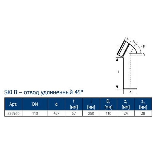 Отвод Ostendorf (PP-MD) удлиненный бесшумная светло-серый Skolan dB SKLB Дн 110х45гр (DN100) б/нап в/к