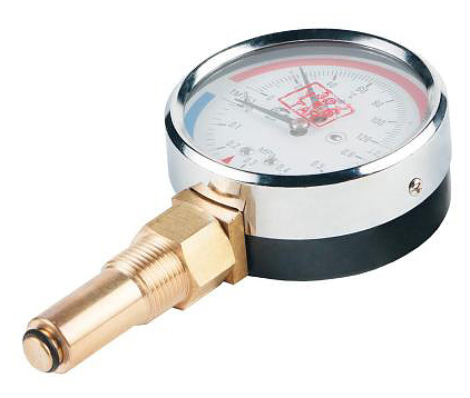 Термоманометр радиальный Росма ТМТБ-41Р.2 00000002367 предназначен для измерения давления и температуры в системах отопления, водоснабжения, бойлерах и паровых котлах. Модель оснащена чувствительным элементом, манометрической и термометрической частью, трибкосекторным механизмом, клапаном и биметаллической спиралью. Корпус прибора выполнен из стали, штуцер манометра - из медного сплава, патрубок - из латуни, циферблат - алюминиевый, стекло-минеральное, кольцо - из хромированной стали. В комплект поставки входит прибор, автоматический запорный клапан, паспорт прибора. Особенности: