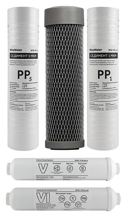 Комплект замены WiseWater Osmos Mineral 5 используется совместно с бытовой системой обратного осмоса Mineral и состоит из 5 сменных картриджей: седимент 5МКМ, картридж сорбции, седимент 1МКМ, посткарбон и минерализатор.