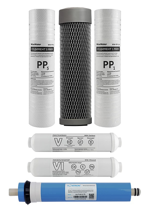 Комплект замены WiseWater Osmos Mineral 6 Membrane используется совместно с бытовой системой обратного осмоса Mineral и состоит из 5 сменных картриджей и мембраны.