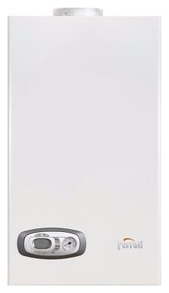 Газовый конвекционный котел Ferroli Divatech D C24 предназначен для совместного использования в системах отопления и водоснабжения в жилых и загородных частных домах, а также других бытовых и хозяйственных объектах. Модель оснащена горелкой Polidoro (Италия) с 11 форсунками, расширительным баком CIMM (Италия), 3-скоростным циркуляционным насосом Wilo (Франция), 2 раздельными теплообменниками, 3-ходовым клапаном с электроприводом, вентилятором Fime (Италия), резьбовыми штуцерами для подключения газа, отопительного контура, подвода холодной и выхода горячей воды, дымовыводящим отверстием, кабелем питания типа HAR H05 VV-F и электронной панелью управления с жидкокристаллическим дисплеем. Вертикально ориентированный корпус с прямоугольными гранями выполнен из стали с антикоррозийным покрытием белого цвета, основной теплообменник Valmex (Италия) – из меди, пластинчатый теплообменник ГВС Gidex (Италия) – из нержавеющей стали, гидравлическая группа – из высокопрочных композитных материалов марки Bitron (Италия).