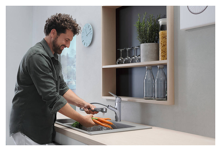 Смеситель Hansgrohe Focus M42 71814000 предназначен для использования в кухонных помещениях для подачи горячей и холодной воды. Модель оснащена выдвижным изливом и керамическим картриджем, обеспечивающим плавный ход рычага смесителя, контроль и точность при выборе напора и температуры воды. Благодаря технологии QuickClean известковый налет и грязь на смесителе исчезнет в мгновение ока, достаточно просто протереть мягкой тряпочкой. Однорычажный тип управления позволяет очень быстро и плавно регулировать подачу воды одной рукой. Особенности: