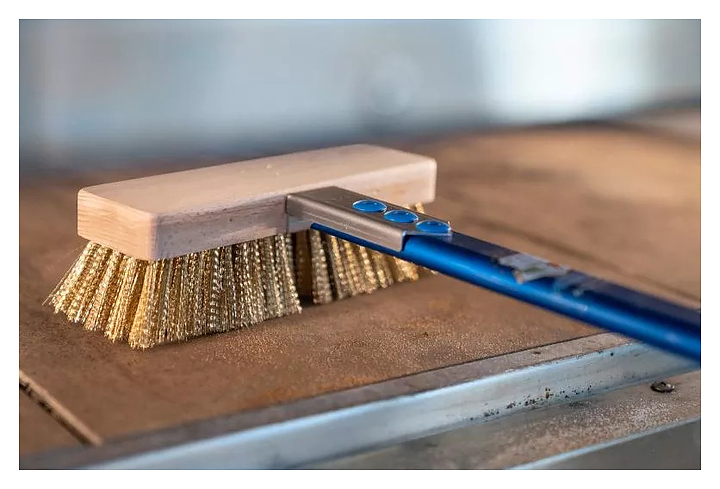 Щетка GiMetal AC-SP3/120 используется на предприятиях пищевой промышленности, общественного питания и торговли для очистки камеры электрической печи для пиццы от остатков продукта, золы и других загрязнений. Модель оснащена длинной рукояткой с отверстием для подвешивания. Рукоятка и заклепки выполнены из анодированного алюминия с покрытием лазурно-голубого цвета, головка – из дерева, щетина – из латуни, скребок – из нержавеющей стали. Особенности:
