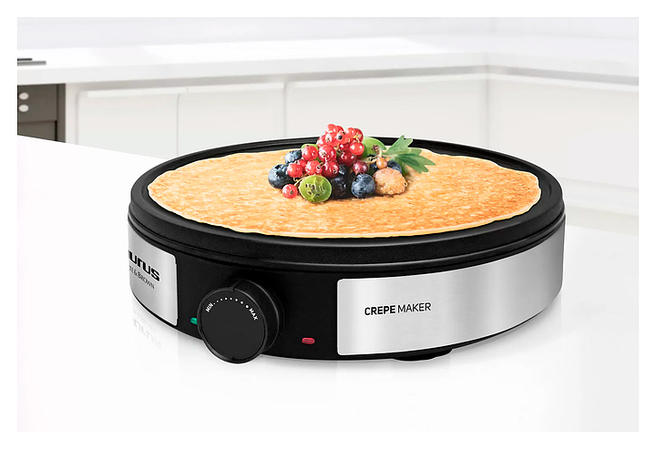 Блинница Taurus S164 предназначена для выпечки круглых блинов в частных домах и квартирах. Модель оснащена регулируемым термостатом и световым индикатором питания и нагрева. Корпус выполнен из нержавеющей стали, рабочая поверхность имеет антипригарное покрытие без содержания PFOA. В комплект поставки входят распределитель для теста и лопатка. Особенности: